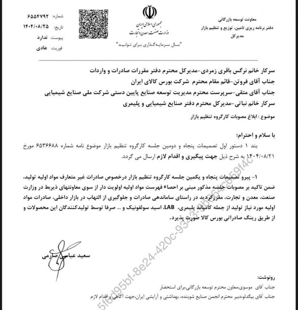 🔹کارگروه تنظیم بازار در مصوبه ای به منظور جلوگیری از صادرات غیرمتعارف مواد اولیه تولید مقرر کرد صادرات مواد اولیه مورد نیاز تولید صرفا توسط تولیدکنندگان